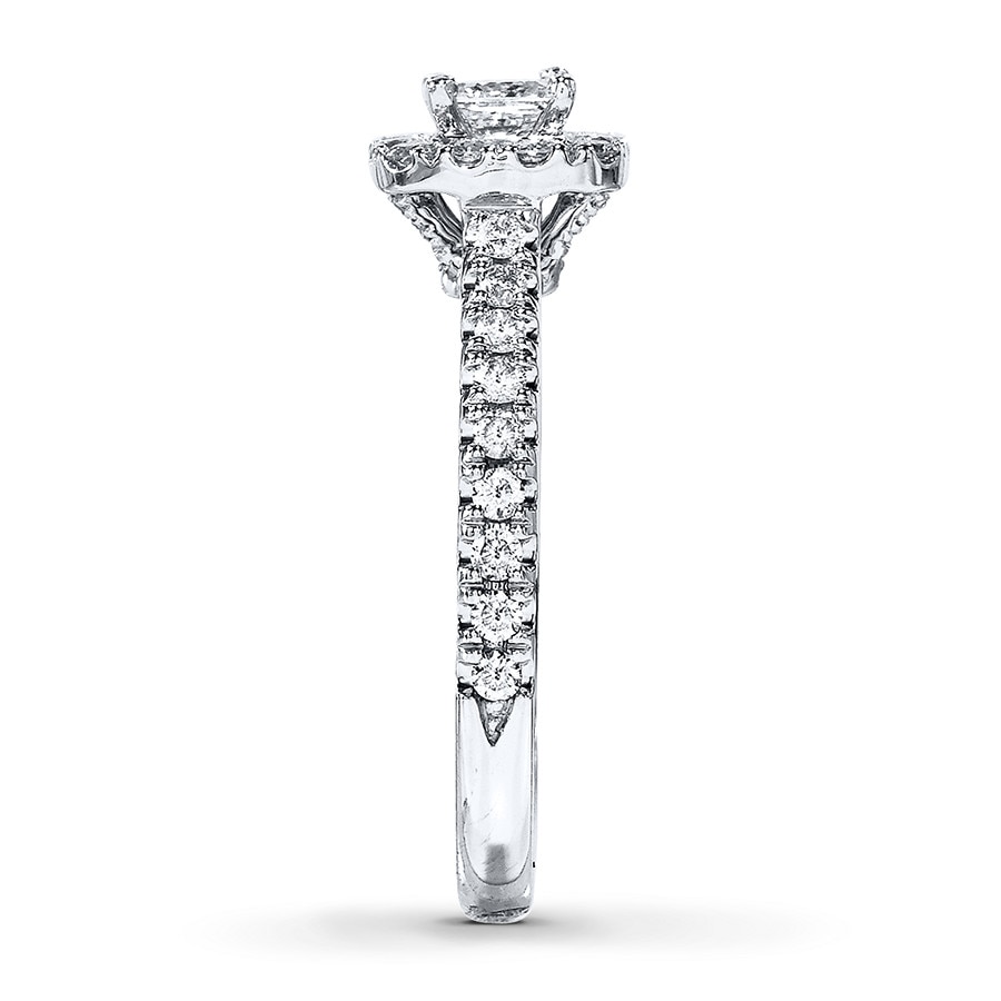 A princess-cut diamond takes center stage in this dramatic engagement ring for her.A supporting cast of round diamonds frames the center and lines the band of 14K white gold for a design worthy of applause. The ring has a total diamond weight of 7/8 carat.