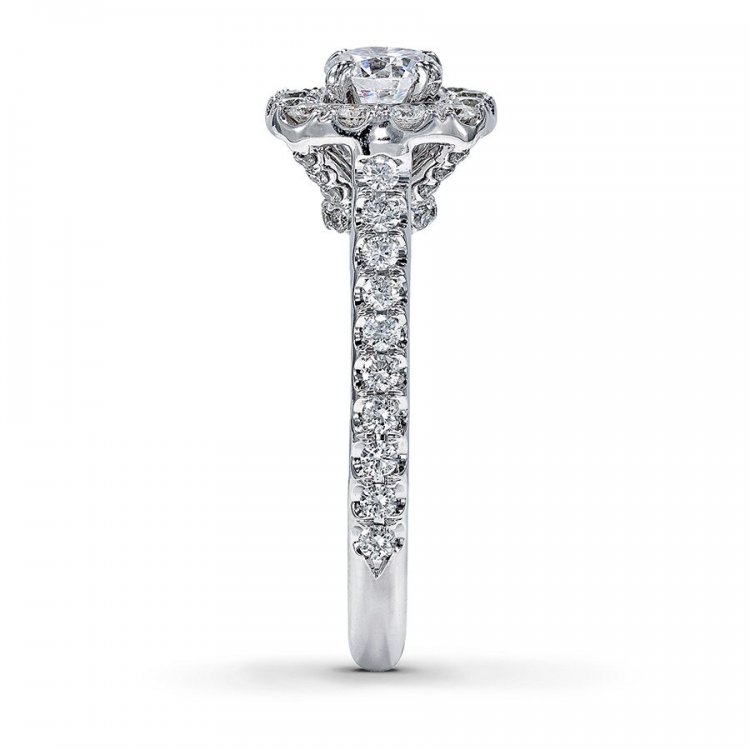 Round diamonds brilliantly frame a picture-perfect round diamond, with a line of round diamonds fanning out on either side. Fine jewelry rings are handcrafted and undergo a four-step polishing process to give each ring its beautiful shine and luster. This engagement ring has a total diamond weight of 1 1/8 carats, and is set in 14K white gold. Available online while supplies last. Previously Owned Treasures are not eligible for in-store pick-up. Previously Owned Treasures may only be shipped either to your home address or to an alternate address.